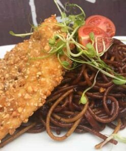 wokban pirított tészta zöldségekkel, szójaszósszal, csirkemell mogyorós bundában
