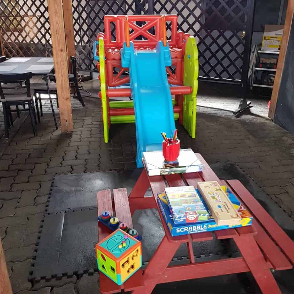 - Kisgyermekes családoknak, akik szeretnének picit megpihenni, nyugalomban, kényelemben étkezni. A gyerekek aktív szórakozásáról csúszdával, mászókával gondoskodunk, ha pedig rajzolni, kreatívkodni van kedvük, külön kis asztalnál krétatáblával, társasjátékokkal várjuk Őket.